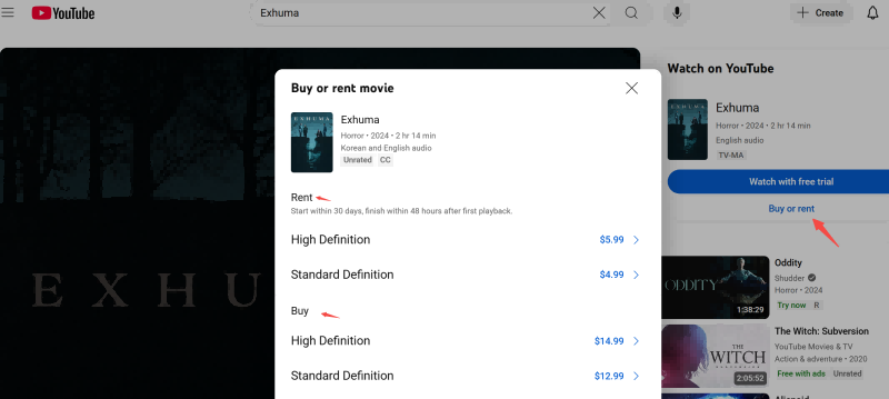 Method 2. Rent and Download Exhuma on YouTube