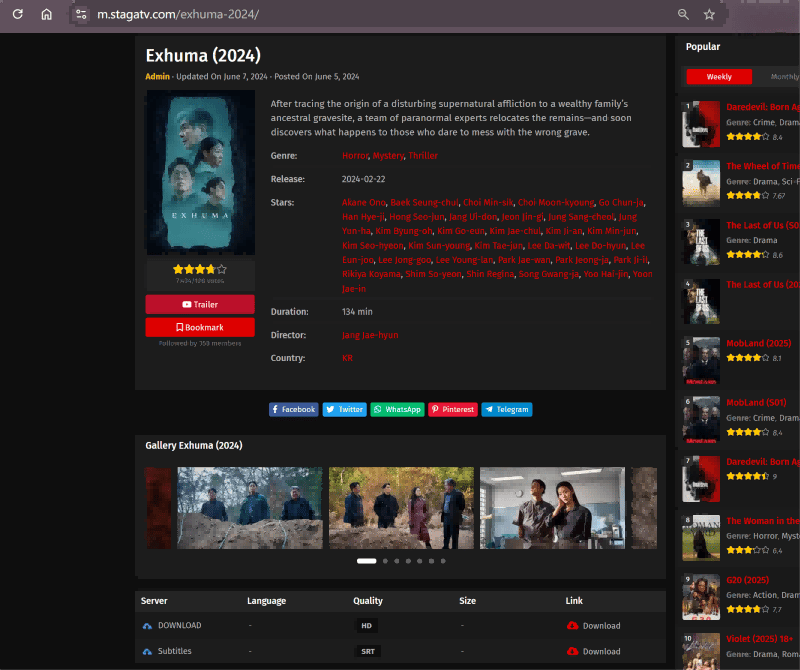 Free movie websites offer a convenient way to watch Exhuma without paying. Being capable of working on browsers, it is also widely used as a great alternative to downloading movies to watch offline on any device. StagaTV, a free movie site that offers a wide variety of the latest movies, is a great place to download Exhuma, too. Here’s the how-to guide.