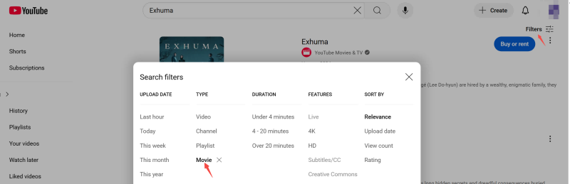 Step 1. Log in to YouTube with your Google account and search for “Exhuma” in the search bar. To get a more accurate match, you can click the “Filter” on the top right and select “Movie”.