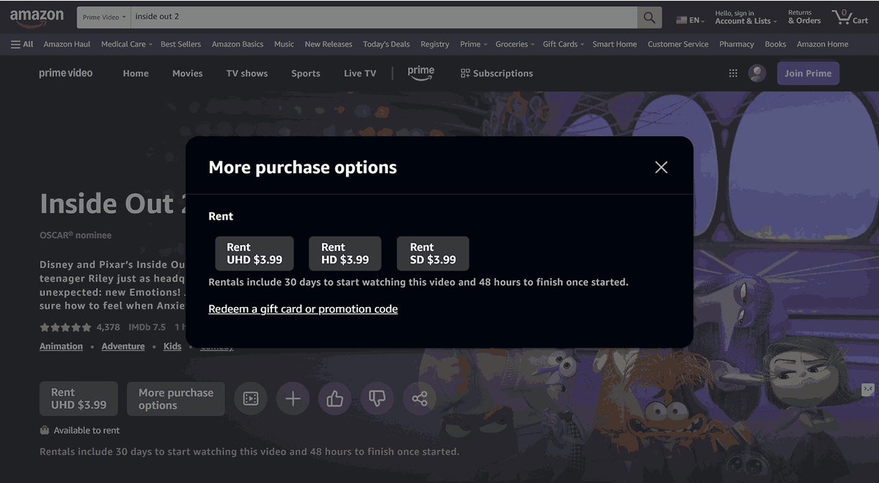 Step 3: Complete the renting process of the movie and wait for Inside Out 2 to stream.
