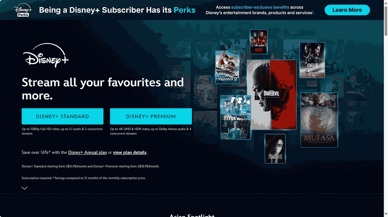- Disney+ Premium: S$18.98/month or S$189.98/year. Up to 4K UHD & HDR video, up to Dolby Atmos audio, up to 4 streams at the same time, and ad-free.