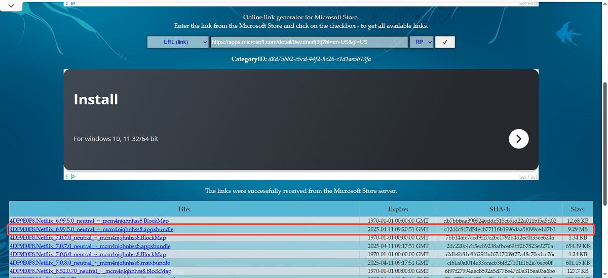 Step 2. Open https://store.rg-adguard.net/ and paste the Netflix app link from Microsoft Store to the search bar and hit the tick icon on the right side. Click the 6.99.5.0 version to download the package. Or directly open this link to download the old version from Google Drive.